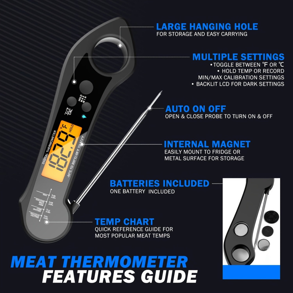 (Fedezd fel az élményt) A digitális élelmiszerhőmérővel a konyhai kalandjaid új szintre emelhetők. Ez a praktikus eszköz tökéletes választás mind a kezdő szakácsok, mind a profi séfek számára, hiszen precíz mérési képességeivel biztosítja, hogy minden étel a lehető legjobban sikerüljön. Az LCD kijelző könnyen leolvasható, így pillanatok alatt ellenőrizheted a húsok, grillételek vagy akár a cukorkák hőmérsékletét. A beépített újratölthető akkumulátor hosszú élettartamot biztosít, így nem kell aggódnod az elemek cseréje miatt. A dupla mágneses tervezés lehetővé teszi, hogy a hőmérőt könnyedén tárold a konyhai fémfelületeken, így mindig kéznél lesz, amikor szükséged van rá.