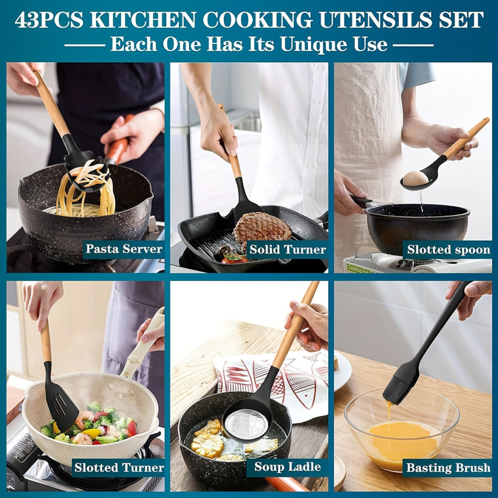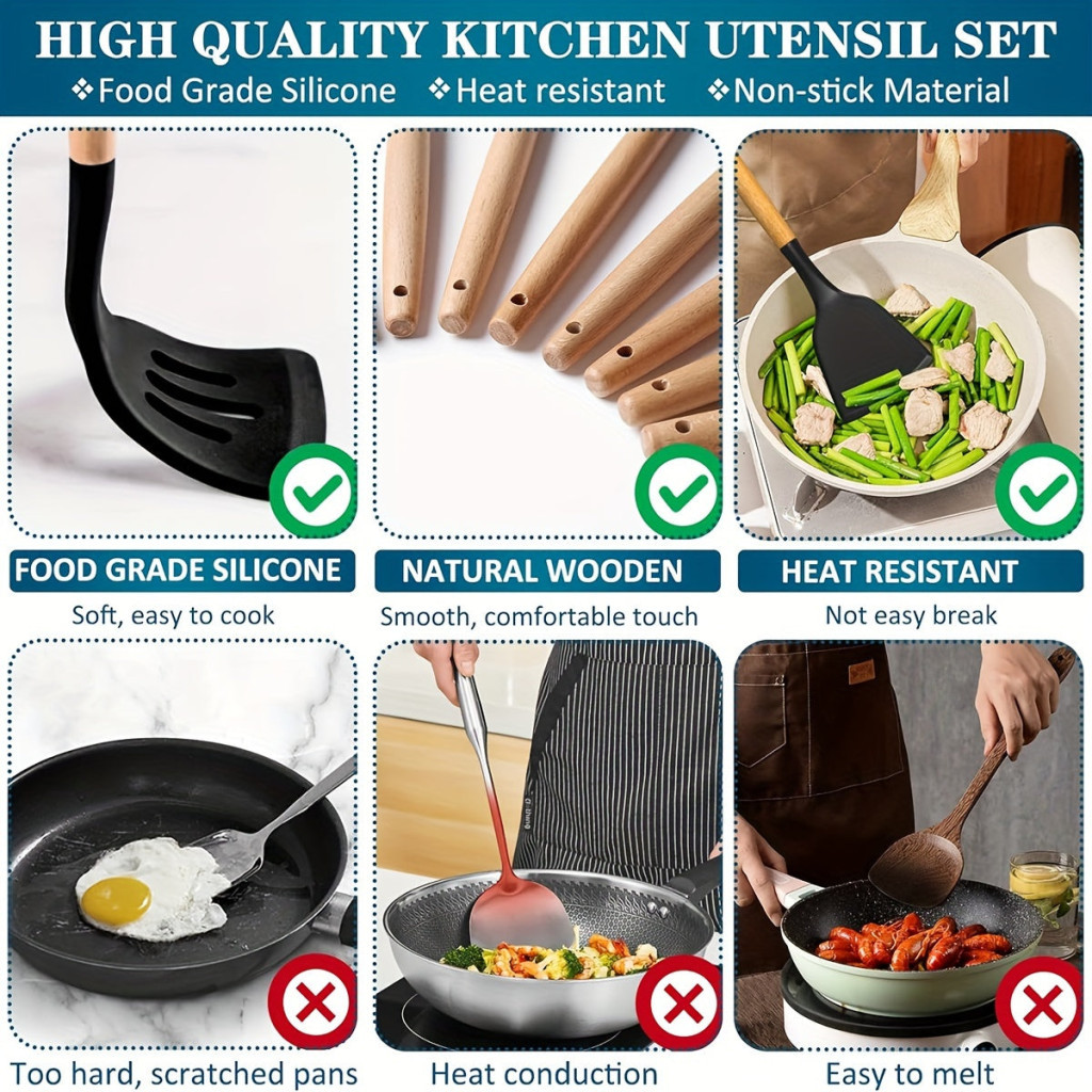 43db/szett, Szilikon Edénykészlet, Tapadásmentes, Hőálló Konyhai Edénylapát Készlet Fa Nyéllel Sütéshez, Főzéshez, Keveréshez,