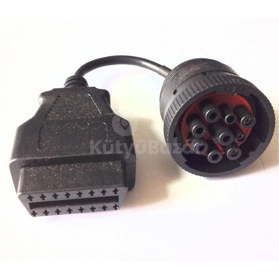 Teherautókhoz használható OBD átalakító kábel, ami 9PIN deutsch J1939 anya és OBD OBD2 apa véggel rendelkezik.