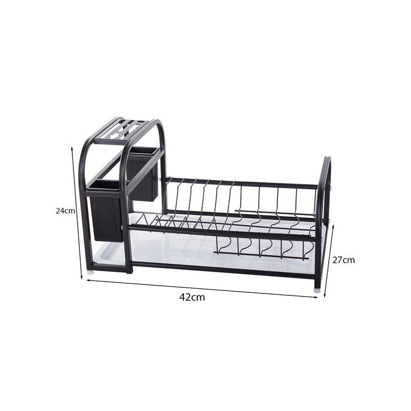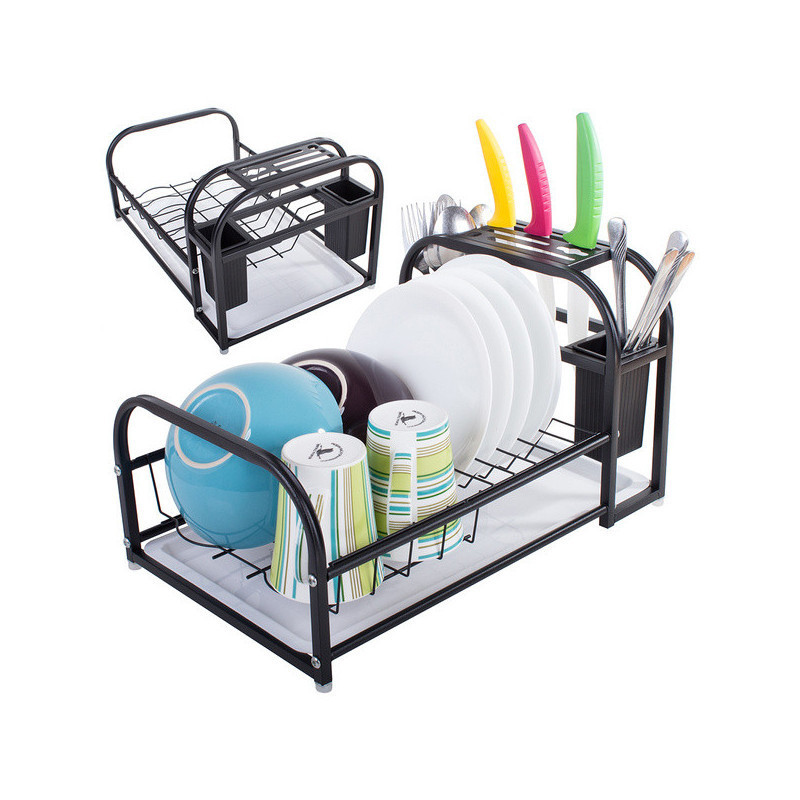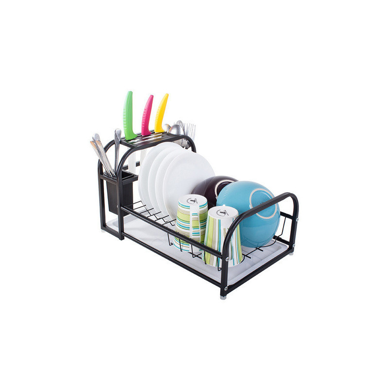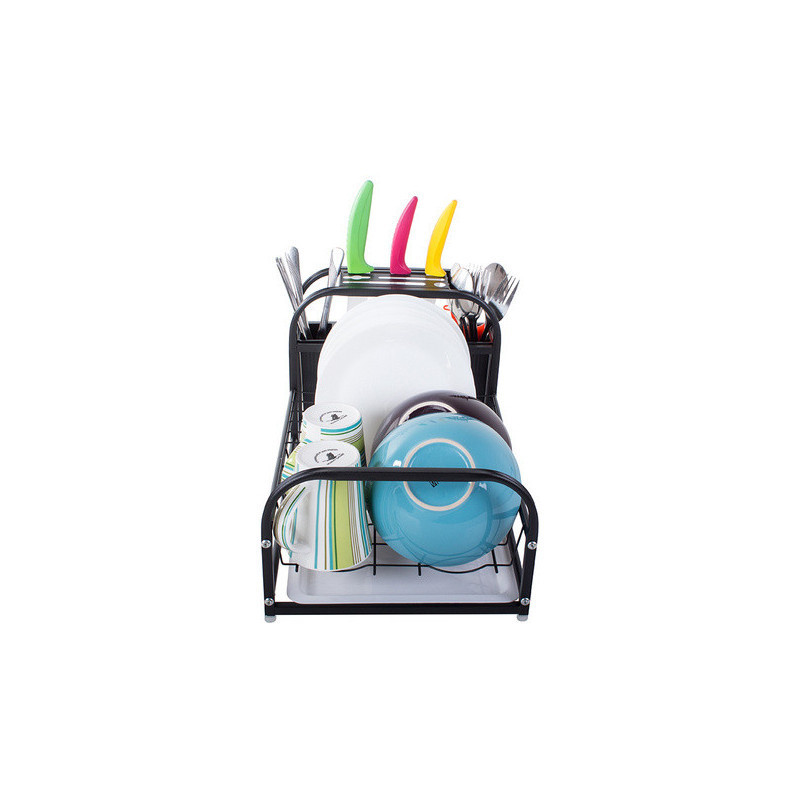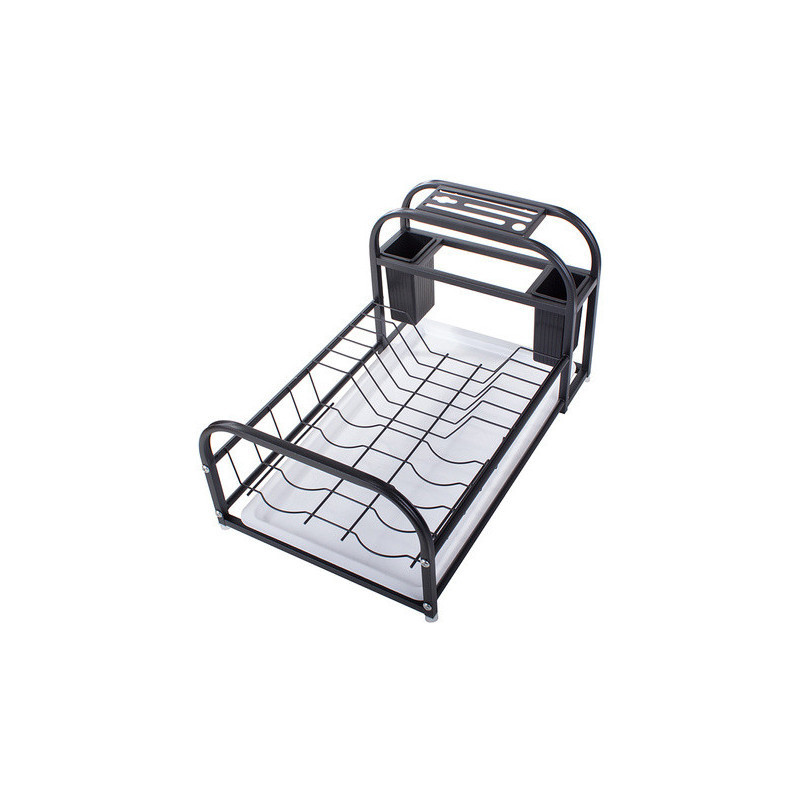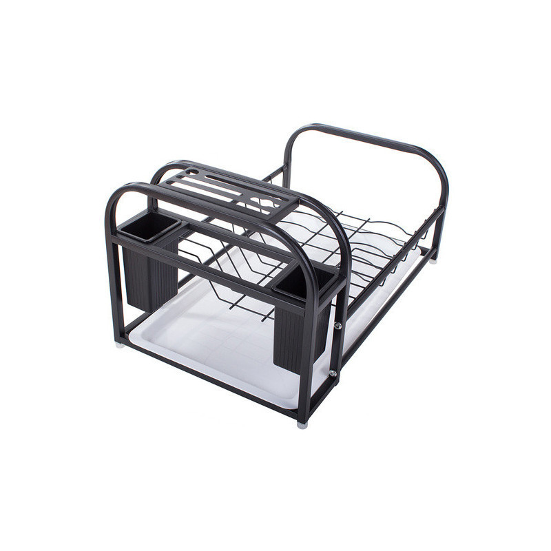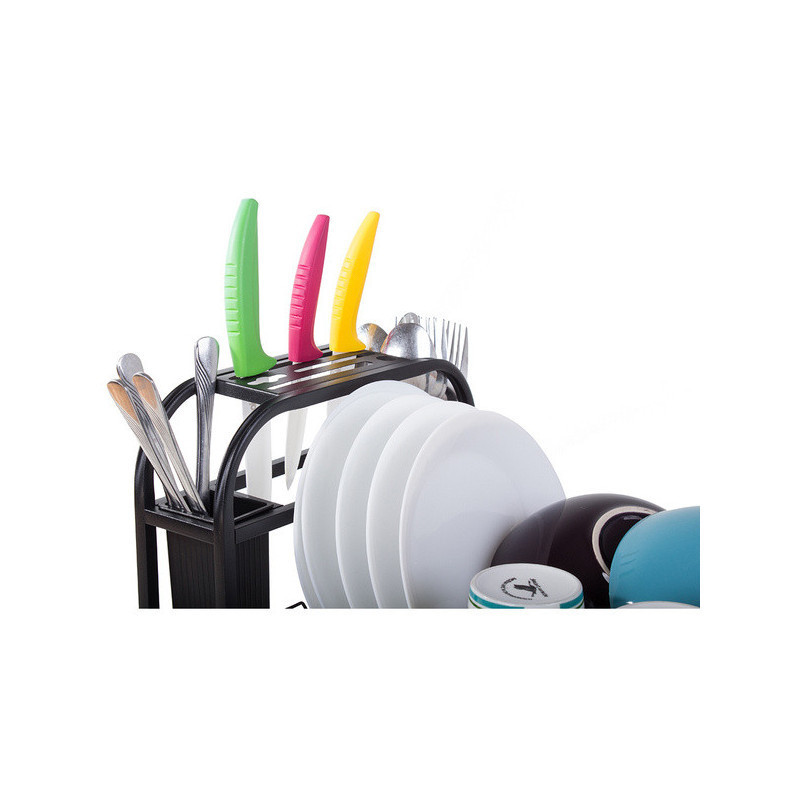 Ez a konyhai szárító magas minőségű porfestett fém anyagból készült. Ellenáll az esetleges sérüléseknek és a nedvesség hatásainak, amelyek nedves edények tárolása során keletkezhetnek. Az stabil konstrukció kényelmesen nagy tálaló alappal biztosítja, hogy a víz ne csöpögjön a munkalapra, és ne károsítsa a bútorokat. A modern loft-stílusú szárító bármilyen belső térbe illeszkedik, és funkcionális dekorációvá válik. A szárítónak helye van 5 tányér számára, amelyeket függőleges rekeszekbe helyeznek, és befogadja a tálakat, csészéket, poharakat és egyéb konyhai eszközöket is. Emellett két evőeszköztartóval és egy késtartóval is rendelkezik.