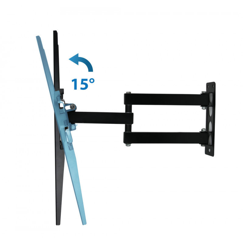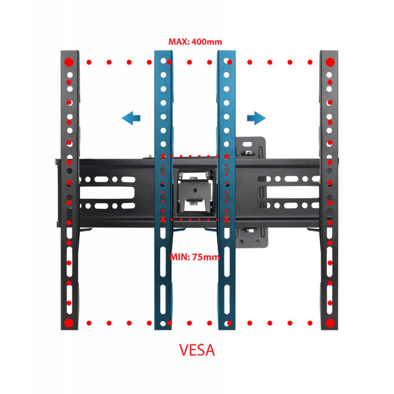 Fém, masszív fali tartó TV-khez 26"-tól 70"-es méretig. Egyszerűen telepíthető. Kompatibilis a VESA szabvánnyal 75x75 - 400x400. Egy kis vízszintezővel érkezik a könnyű felszereléshez. A tartón állítható dőlésszög, vízszintes irányban állítható lekanyarodási szög és a TV távolsága a falból is állítható.