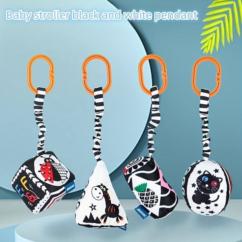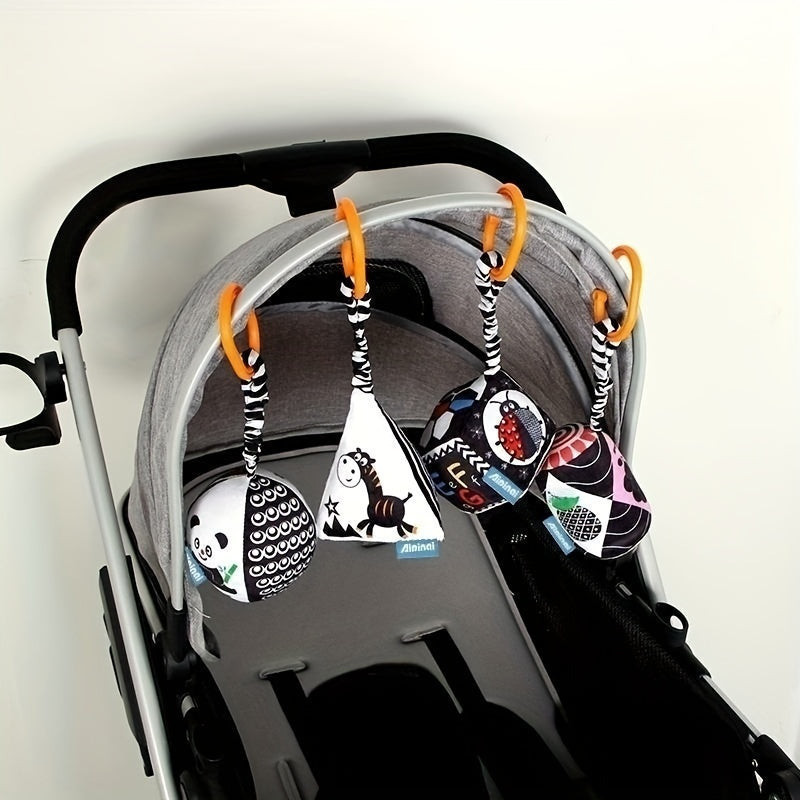 Tulajdonságok: (Szórakoztatás) A fekete-fehér mintázatokat nézve a csecsemők figyelme fokozódik, ezáltal megnyugtatja és fejleszti az őket. (Megértheti a textúrát) A különböző anyagok és formák tapintásra való felfedezése segíti a kisgyermekeket a világ felfedezésében. (Könnyen csatlakoztatható) Egyszerűen rá tudod kötni a játékot a babakocsi fogantyújára, így mindig kéznél van, amikor szükség van rá. (Mobil) A hordozható méretnek köszönhetően bárhová magaddal viheted, hogy mindig legyen szórakoztató elfoglaltság a kisbabád számára. (Biztonság) Speciális kialakítása miatt nincs benne apró elem, így teljesen biztonságos a kisgyermekek számára.
