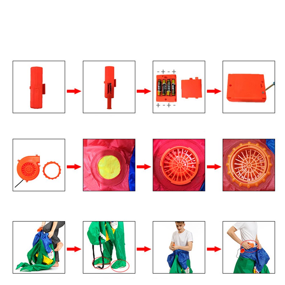 A jelmezt egy beépített elektromos pumpa fújja fel, ami 4 darab AA elemmel működik.