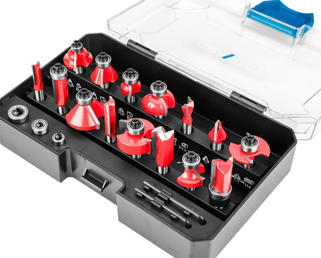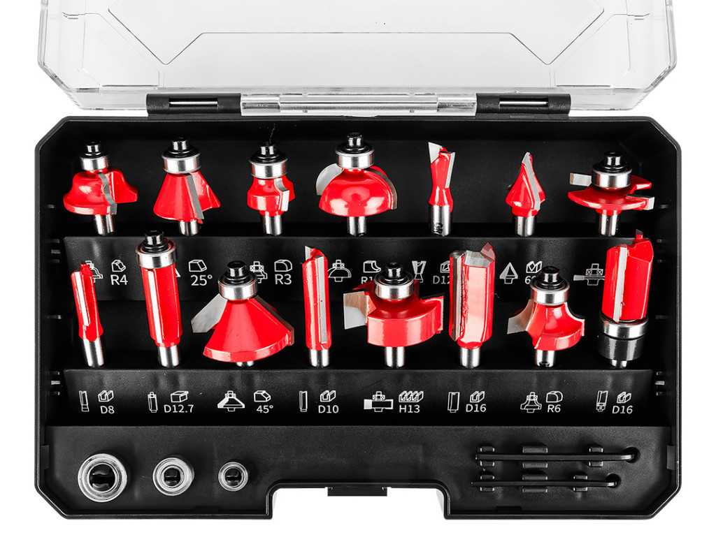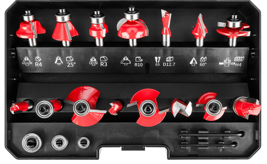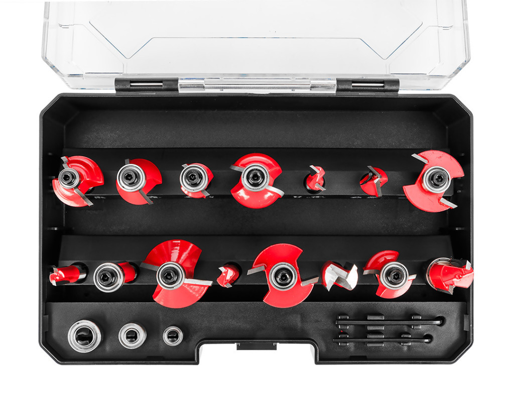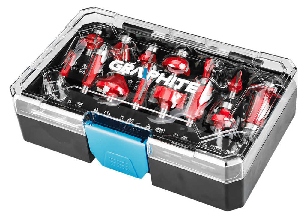 GRAPHITE 56H241 Felsőmaró készlet, 8mm-es szárral. 15db-os készlet, amelyet fa, rétegelt lemez, PVC és forgácslap megmunkálására terveztek. Tartós és kopásálló karbidból (penge) és TCT-ből készült, így hosszú ideig használható, nélkülözhetetlen szerszám.