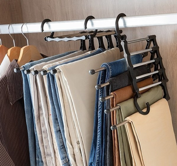 A nadrágok tárolása megoldható polcon, fiókban vagy akasztón, de vannak kifejezetten a nadrágok tárolására készített megoldások is.