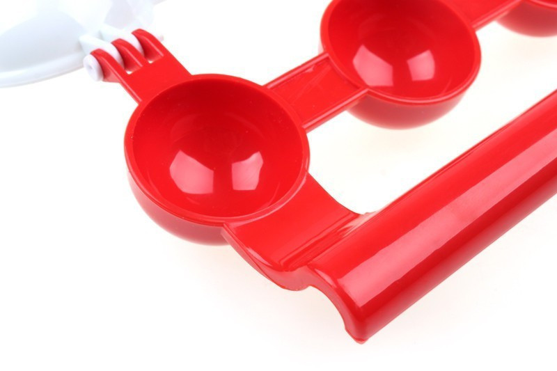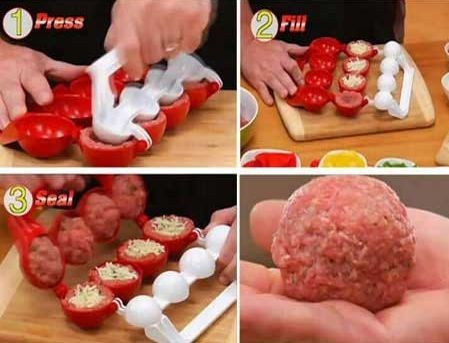 Helyezd a darálthúst a középső tároló kanálra, fordítsd és nyomd rá a fehér kanalat, töltsd meg a mélyített húst a kívánt töltelékkel, majd töltsd meg a másik piros kanalat darálthússal és fordítsd rá a megtöltött húsgombócra! És kész is!