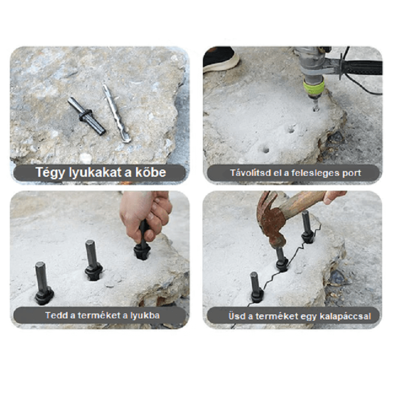 Ennek a terméknek köszönhetően kézzel is széthasíthatsz követ, gránitot, márványt, aszfaltot, bazaltot, homokkövet vagy bármely egyéb kemény anyagú, tömör kőfélét és ásványt. Két méret áll rendelkezsére, 16 és 18 mm-es átmérővel, így megtalálod a neked megfelelőt. Használata egyszerű: fúrj egy 50 mm mély, 16/18 mm átmérőjű lyukat a hasítandó anyagba, távolítsd el a felesleges port, helyezd a terméket a lyukba, majd üss rá határozottan. A nyomástól a kő szétesik abban a méretben és csíkban ahogy azt te szeretnéd.