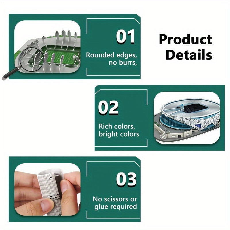(Kreatív dizájn) A puzzle elemei aprólékosan kidolgozottak, hogy a lehető legvalósághűbb stadionmodellt építhesd meg. A részletek gazdagsága és a színek élethűsége biztosítja, hogy a kész mű egy igazi látványosság legyen.