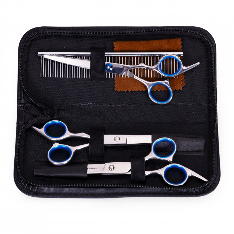 Az olló készlet biztonságos vágáshoz és ápoláshoz lett tervezve kutyák és macskák számára, biztosítva a pontosságot és kényelmet mind a tulajdonos, mind a házi kedvenc számára. A készlet tartalmaz három különböző típusú ollót amelyek alkalmazkodhatnak különböző ápolási igényekhez. Ezen felül, az ápoló készlet tartalmaz egy praktikus fésűt ami jól működik mind sima, mind csomós szőrzetnél, mindezt egy kis öko-bőr tokban.