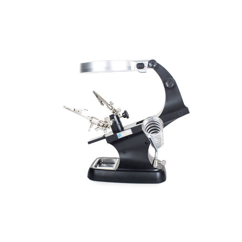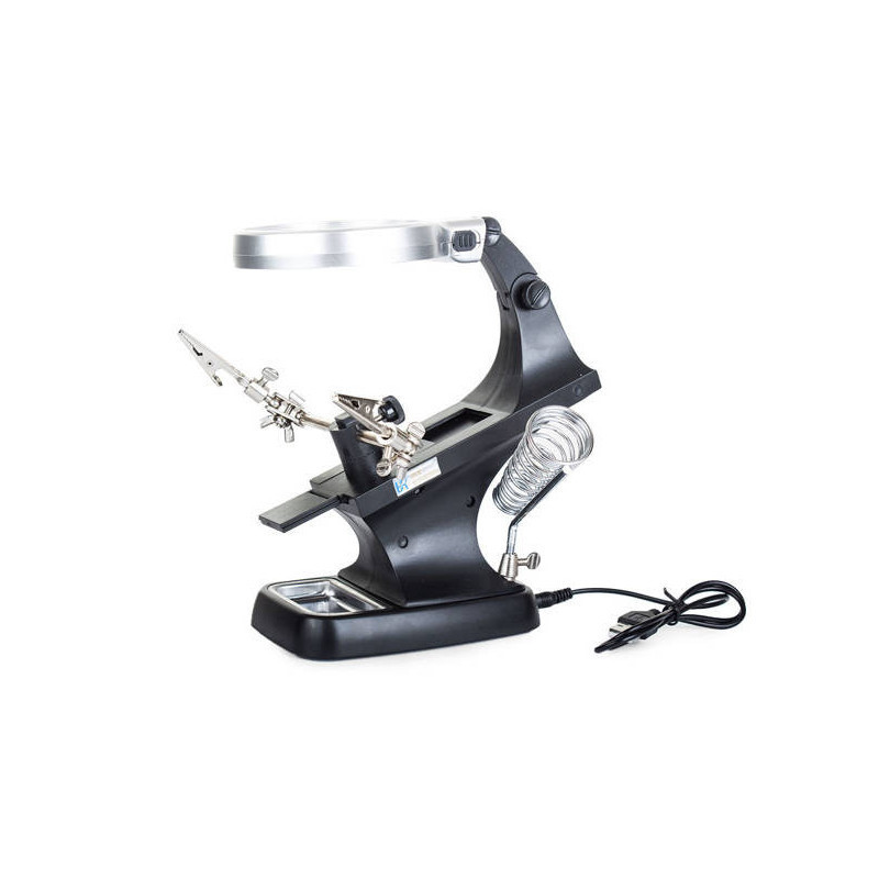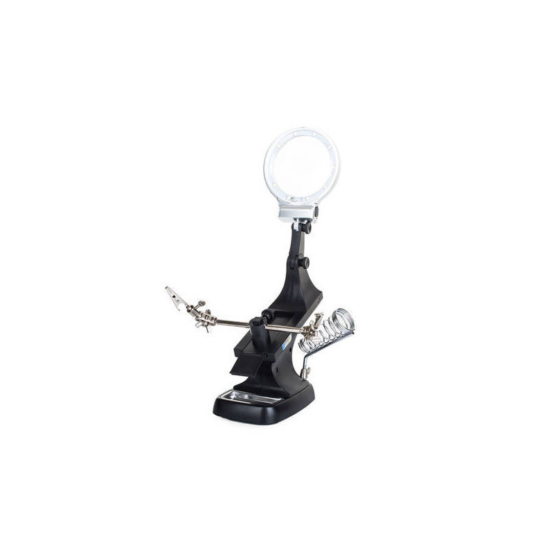 Ez a profi harmadik kéz, amely egy nagyítóval 3x 75mm és 4.5x 20mm ideális eszköz a barkácsolók számára. Használhatják ékszerészek, numizmatikusok, elektronikai szerviztechnikusok, órások stb. Erős krokodilokkal rendelkezik, amelyek szorosan tartják a munkadarabot, és teljesen állítható ízületekkel a kívánt munkadarab rögzítéséhez. A nagy nagyító és a 10 LED világításnak köszönhetően a kép nagyon tiszta és könnyen olvasható. A harmadik kéz olyan munkát tesz lehetővé, mint: ️