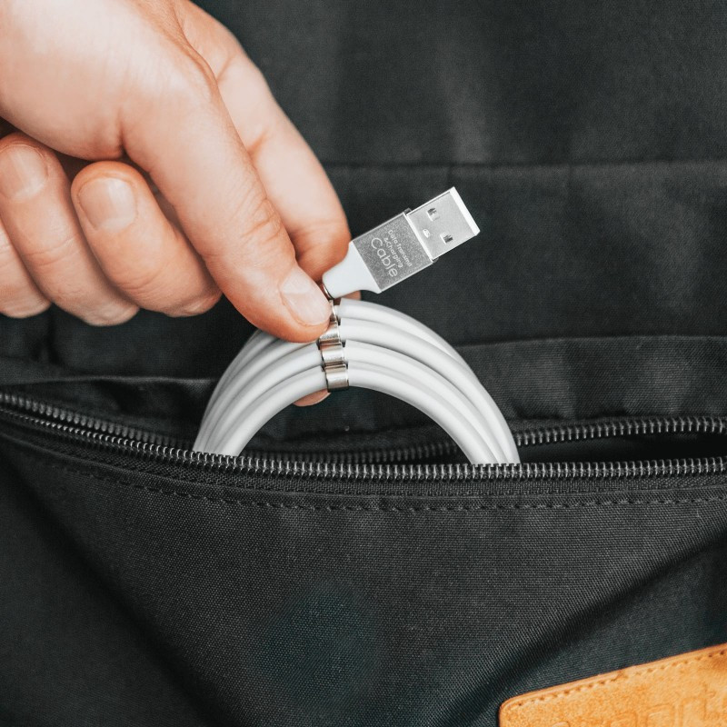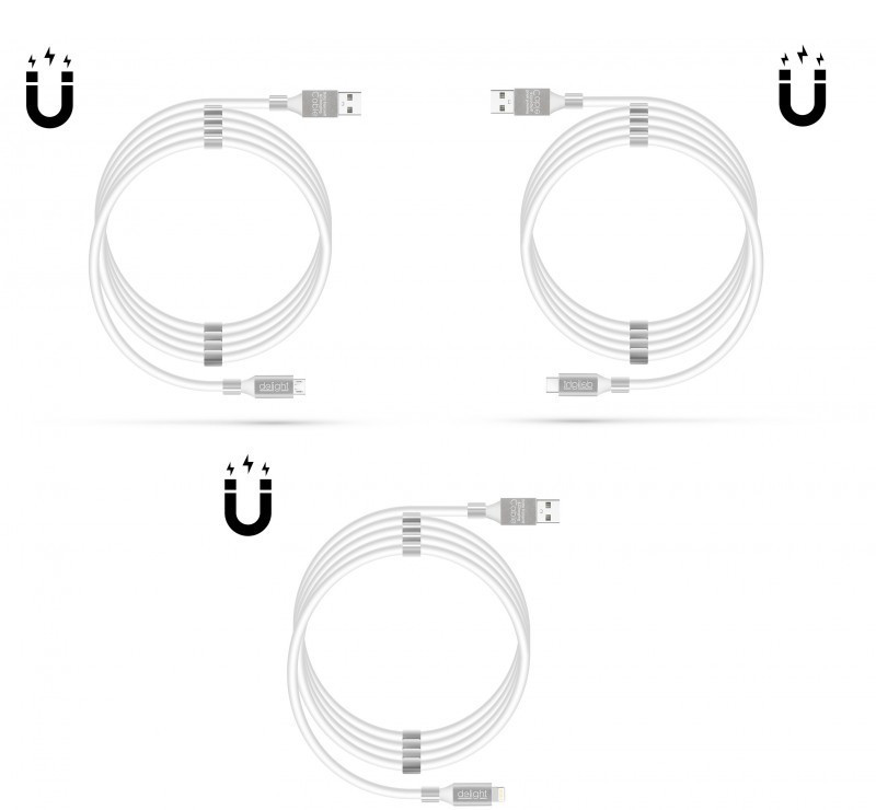 MicroUSB / USB-C / Lightning (Apple) csatlakozóval szerelt adatkábel, amely alkalmas adatátvitelre és készüléktöltésre is. A kábel teljes hosszán elhelyezkedő 10 db mágnes segít a rendezett kábeltárolásban, valamint a felesleges kábelhossz könnyen összefogható. A szilikon védőborítás megvédi a kábelt az esetleges külső sérülésektől, valamint fontos szerepet tölt be a mágnesek elhelyezkedésében. A mágneseknek köszönhetően a kábel gubancolódásmentesen tárolható tetszőleges formában.