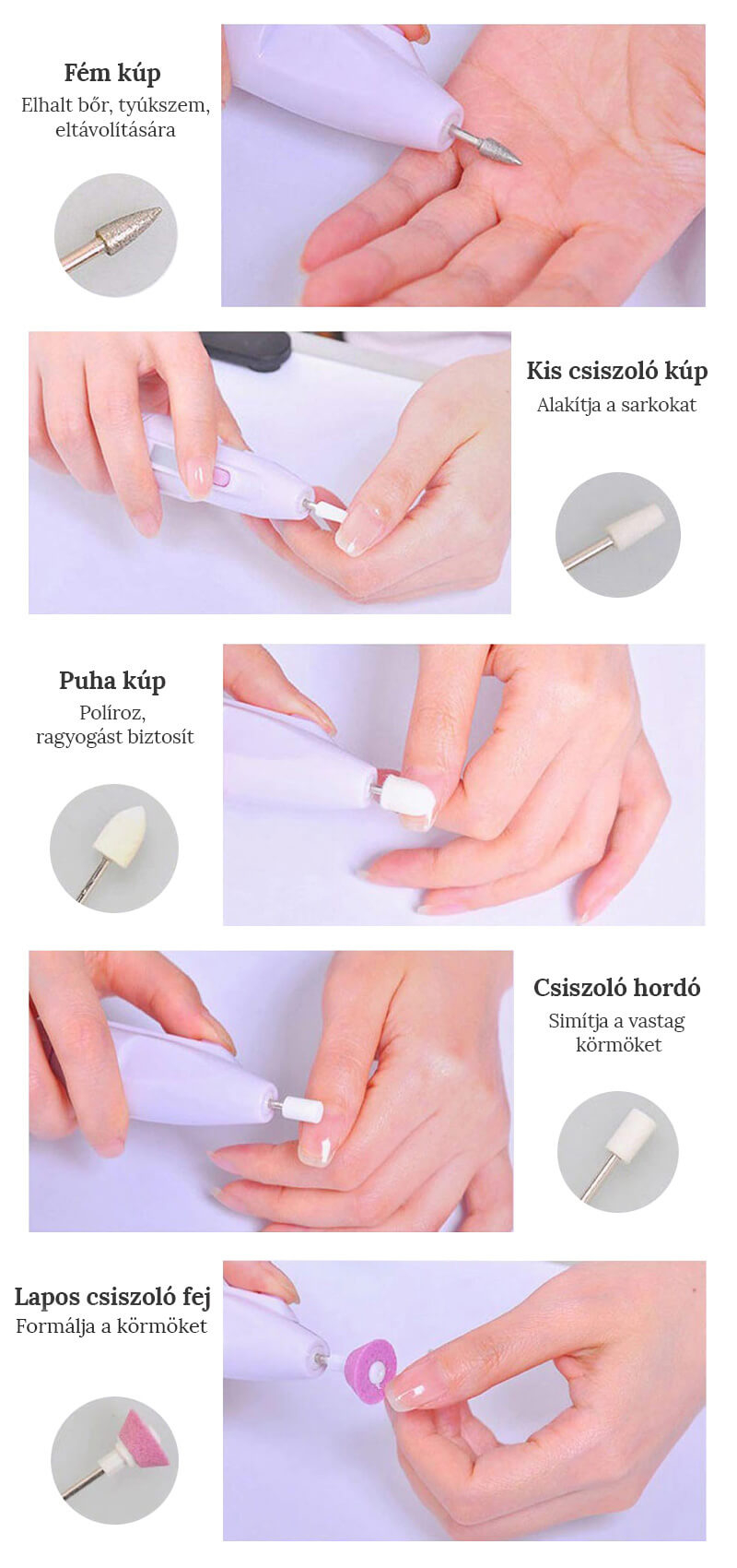 A cserélhető fejeknek hála minden ápolási folyamatot el tudsz végezni vele. Nemcsak körömápoláshoz, hanem műköröm felhelyezés előtti körömcsiszoláshoz is tudod alkalmazni a szettet.