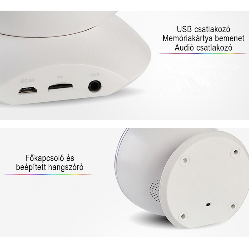Ennek a kütyünek az alkalmazásával nemcsak a látvánnyal, de hangzással is megteremtheted az igazi nyugodt és otthonos hangulatot. A vetítő beépített hangszóróval, memóriakártya olvasóval, illetve audio bemenettel rendelkezik, így kedvenc dalaidat is hallgathatod míg a lámpa világít.