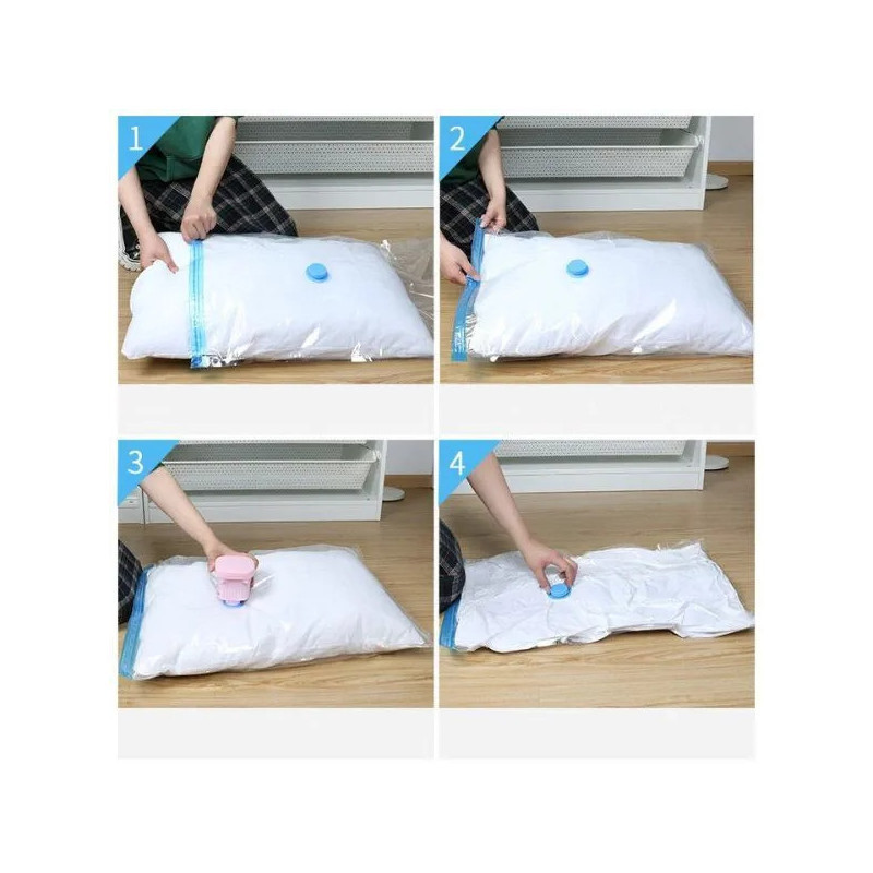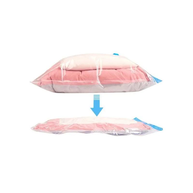 A helytakarékosság mestere! Fáraszt a rendetlenség? Szeretnél több helyet a szekrényben vagy a bőröndödben? Itt a megoldás! Csak pakold be a cuccaidat ebbe a zseniális vákuumzsákba, és egy sima porszívóval szívd ki belőle a levegőt. Az eredmény? Akár 80%-kal kisebb térfogat! Képzeld el, hogy akár 4 takarót is belepakolhatsz egyetlen zsákba.