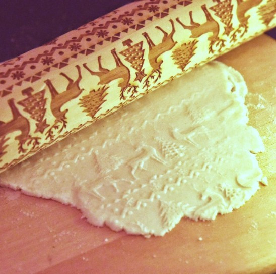 5. Alaposan lisztezett felületen nyújtsd ki 2-3 milliméter vastagra a tésztát és erőteljes mozdulatokkal mintázd meg a mintás sodrófával.