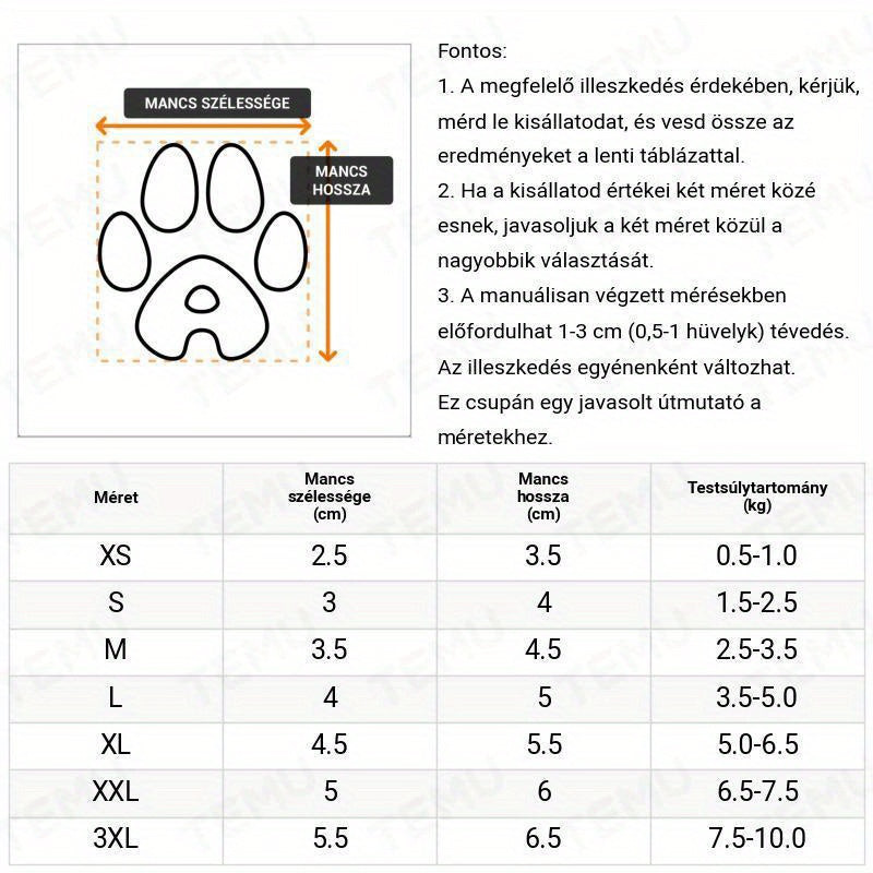 Ha te is azok közé a gazdik közé tartozol, akik mindent megtesznek kedvencük kényelméért és védelméért, akkor ezek a kutyacipők neked valók. Nemcsak hogy megóvják a kutyád mancsait a hidegtől, nedvességtől és sérülésektől, de stílusos megjelenést is kölcsönöznek neki. A vízálló kialakításnak köszönhetően bármilyen időjárási körülmény között bátran útnak indulhattok. A tartós anyagok biztosítják, hogy a cipők sokáig kitartsanak, így hosszú távon is megbízható társai lesznek a mindennapoknak. Szerezd be most, és adj kedvencednek egy kis extra törődést, amit megérdemel!