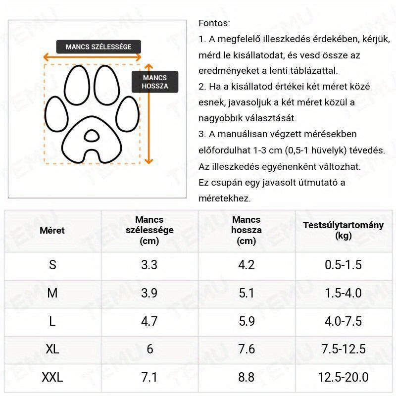 (A kiskutya csizmák) A kutyád megérdemli a legjobbat, és mi lehetne jobb, mint egy pár esőálló kiskutya csizma csúszásgátló kialakítással? Ezek a csizmák nem csupán stílusosak, hanem praktikusak is, hiszen megvédik kedvenced mancsait a nedvességtől és a csúszós felületektől. Akár egy esős sétára indulsz, akár csak a hátsó udvarban játszotok, ezek a csizmák garantálják, hogy a kutyád mancsai szárazak és biztonságban legyenek. A modern dizájn és a kényelmes kialakítás miatt a kutyád imádni fogja viselni őket.